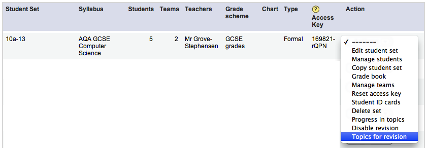 Yacapaca needs to know which topics have been covered. It will only display questions related to those topics. Go to Students -> Student Sets and for your new set, open the Actions dropdown. Choose ‘Topics for revision’.