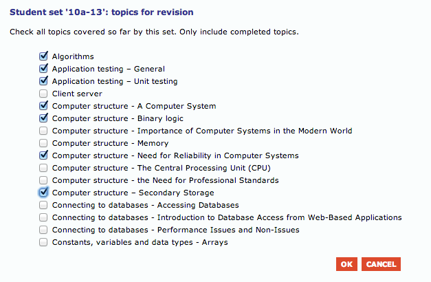 3. From the Topics popup, select all the topics that have so far been covered in class. Do not add topics that should have been covered but weren’t. Yacapaca can’t do that job for you, sorry!