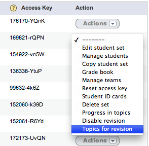 2. For each student set you want revision for, select “Topics for revision” from the Actions dropdown. If it’s not visible, check you have a syllabus set for the student set. If it’s still not visible, you’re out of luck. We don’t have topic mapping for that syllabus yet. Write to me and I’ll help you set it up for yourself.