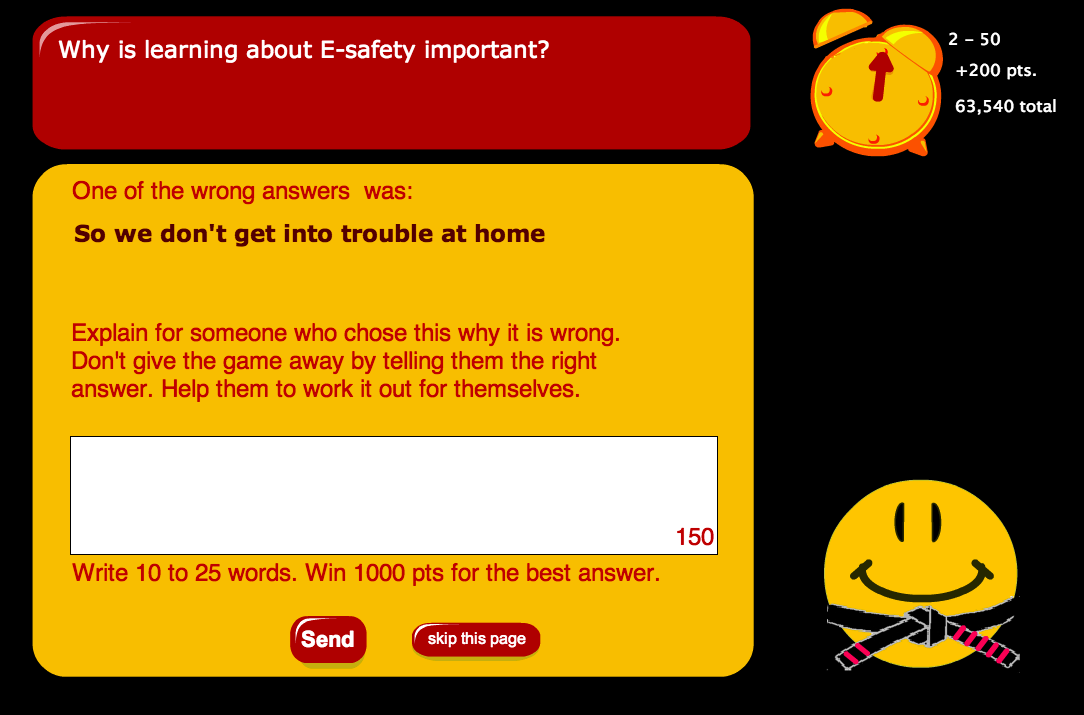 1. After approximately one question in ten, students are presented with the screen below. They are asked to write a feedback statement for other students, in 150 characters or less – the size of an SMS or a tweet. They only see this screen if they got the answer right, and it is not compulsory – there is always the option to skip this activity.