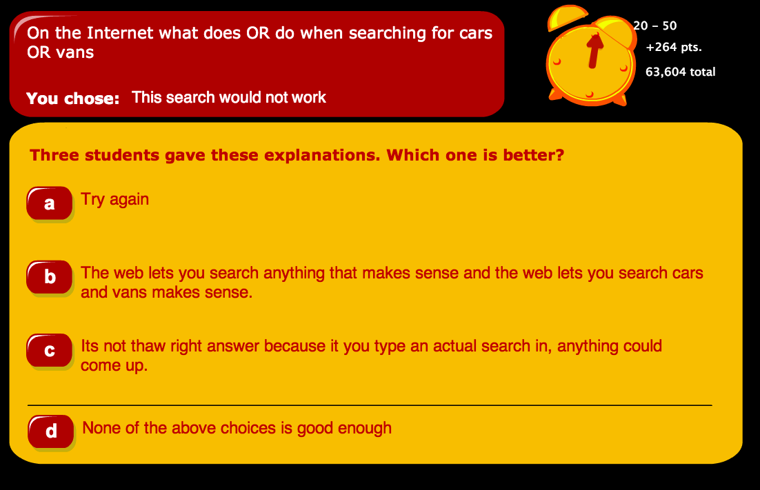 Each action wins the student motivation points which can go towards a better avatar, or even a real-world prize. They don’t currently count towards the final grade from the quiz.