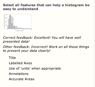 Again, nicely referenced to an illustration, and with nice short options. I feel it is too easy to guess that the correct response is to tick all the options, especially if that is something the author is prone to. We all have our patterns as authors, and the kids quickly pick up on them. I was also less thrilled with the very generic feedback statements. Histograms are such interesting things that I’m sure something more could have been done here.