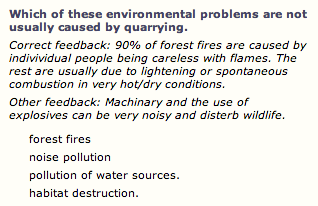 Technically, a checkbox question is a collection of simple yes/no questions. We could have written the example above as four independent yes/no questions: “Are forest fires a problem typically caused by quarrying? Y/N” etc. But note that the answer that would earn the mark would be “no”: what we want the student to do is leave this box unchecked. Consequently leaving a box unchecked is as significant an action as checking it.