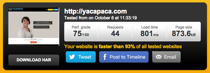 Pingdom is a service that tests your homepage by accessing it from a remote server, and timing how long it takes each individual component to load. I tested Yacapaca from their Amsterdam server at peak time (11:33) this morning, and got the encouraging result that we are “faster than 93% of all tested websites”.