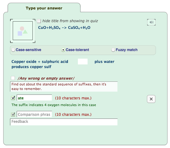 And it gets worse. Students might answer [coper sulfate], [copper suflate] or any one of dozens of possible misspellings that would still indicate that they knew the correct suffix was ‘ate’. Trying to enter a list of all possible answers would be exhausting and probably futile.