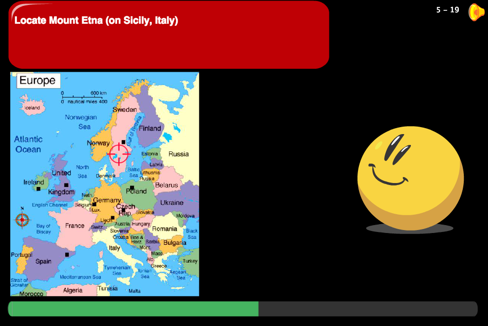 The only example I am slightly critical of. That’s an awful big map to find one place on an island. I’m not sure kids doing this on their phones will score the point, even if they know the answer. I would have preferred a smaller area mapped so that Sicily was bigger, and a clearer instruction to click on the island, not the volcano itself.