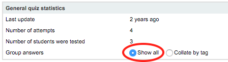 You can view statistics in two ways. “Show all” is self-explanatory, and is the one you are most likely to want for previewing questions. “Collate by tag” groups questions according to the Key Concept tags so that you can review the overall level(s) of understanding of the students. The value you select is remembered and applied by default to the next stats page you look at.