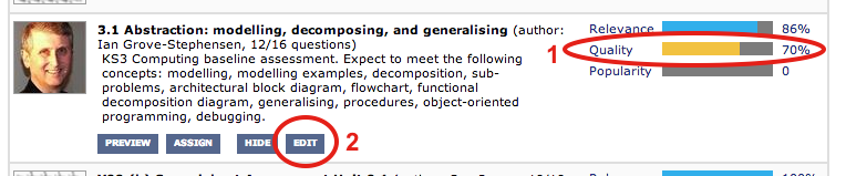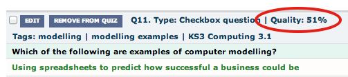 Now scan down the list of questions. The quality of the quiz is simply an average of the qualities of the individual questions. You will get the quickest results by focusing on the lowest-quality questions. Here is where to see the quality metric: