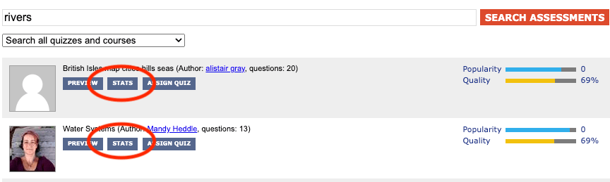 You can also export any assessments you use or rely on, even if you are not the author, because they are all published under a Creative Commons sharealike license. The trick is to use the ‘Stats’ button, rather than the ‘Edit’ button.